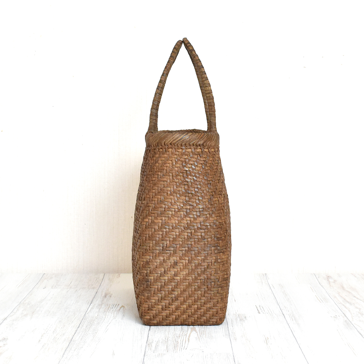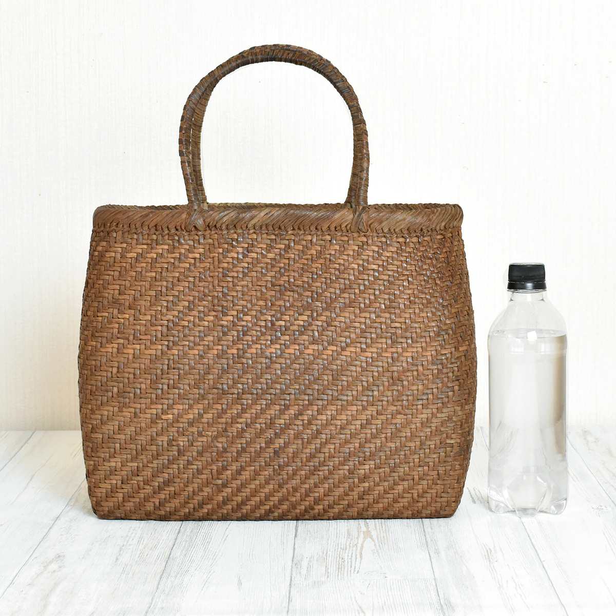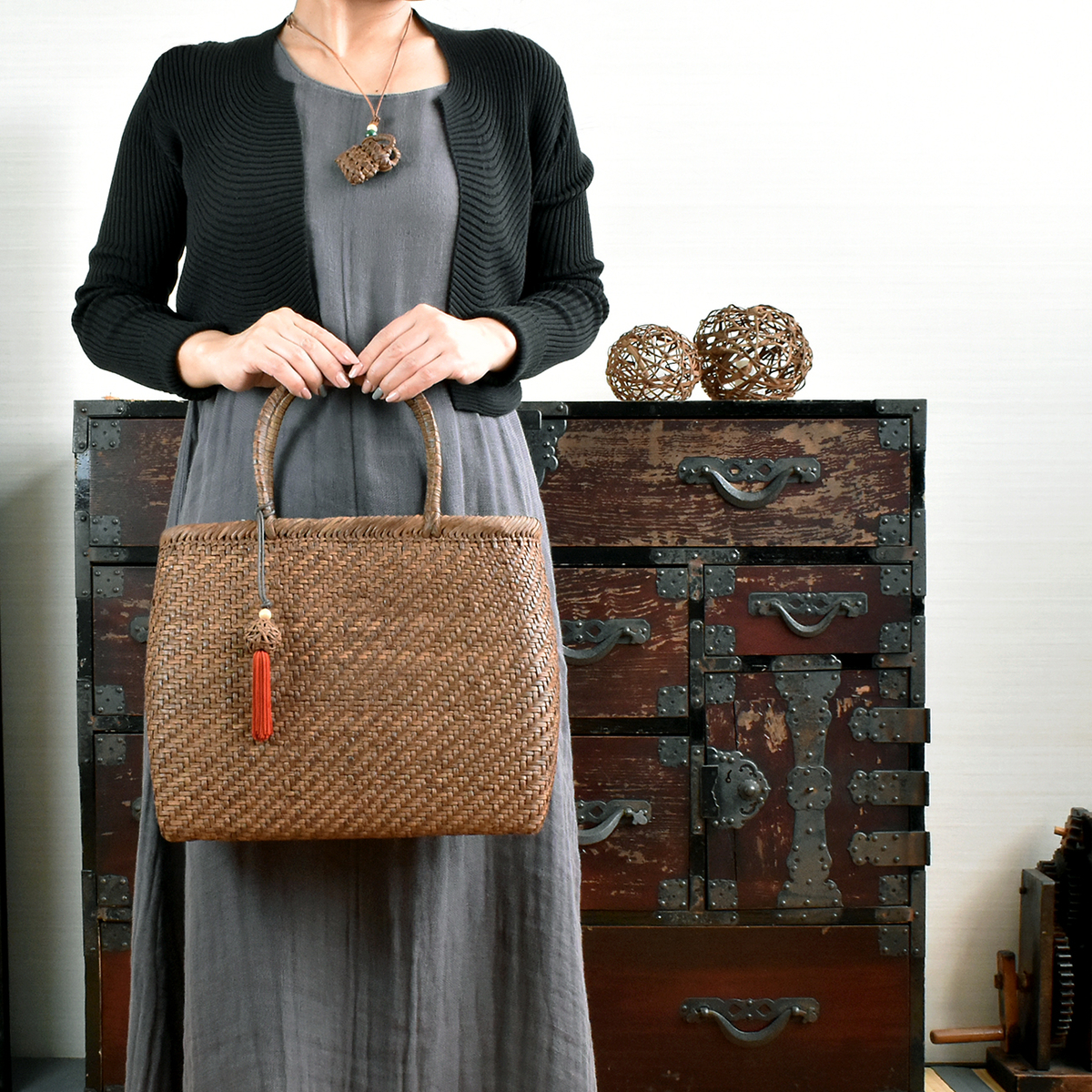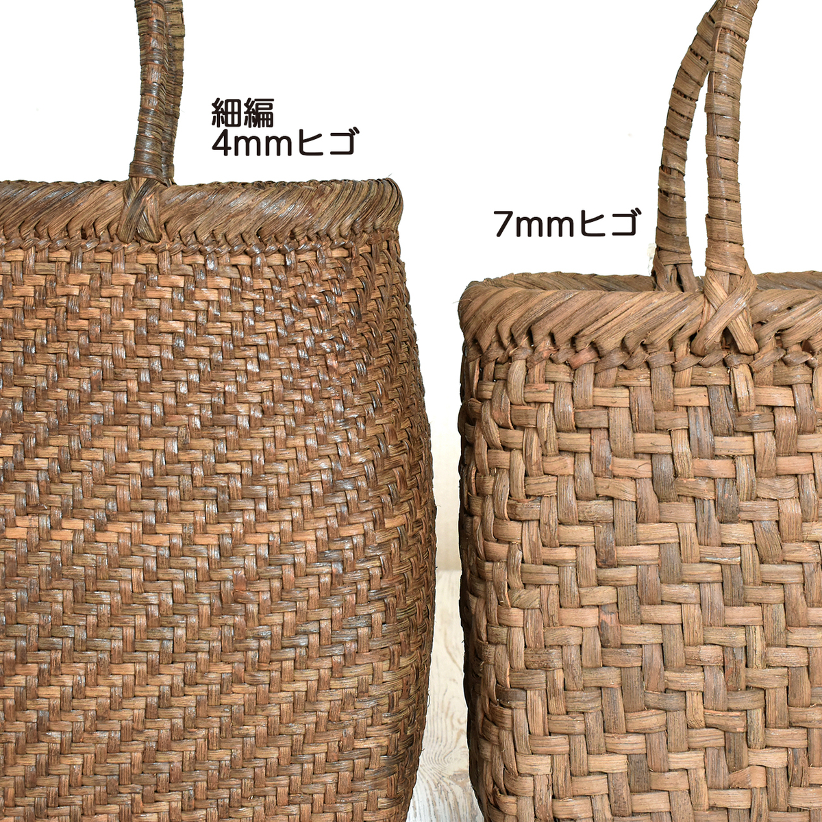 HOME | あじろ編み | SALE 20%OFF【国産】山ぶどう蔓カゴバッグ「角丸中・細編」※おかざりフサ付 あじろ編み SALE 20%OFF【国産】山ぶどう蔓カゴバッグ「角丸中・細編」※おかざりフサ付 販売価格 334,400円 (税込み) 通常価格 418,000円 (税込み) 在庫 1 1 カートに入れる メーカー 野々花染工房 ブランド みちのく蔓工芸所 商品情報 蔓カゴ製品 丸型タイプ 個別送料 0円 送料 無料 編み方 あじろ編 タイプ 丸型 サイズ (約)幅30cm マチ幅11cm 高さ26cm(持ち手含まず) 蔓幅 約4mm 重さ 約380g 材質 国産山ぶどう蔓 製作 日本 ※当社のカゴはすべて山形県産材料の採集から製作、アフターケアまで一貫して行っております。 ※5日〜10日で発送いたします。 ※催事にて同時に販売しております。品切れの場合は、受注生産となります。 商品発送時期についてはお問い合わせください。 【角丸・中・細編】約1年程、催事などで見本品として展示していた商品です。色も艶も(いい具合に)変化してきたため販売いたします。4ミリ巾のヒゴで編んだ「細編」は何といってもその軽さ、美しい編み目としなやかさに魅了されます。より厳選した材料を薄く削りしっかりとあじろに編み込んだ、職人の技の集大成ともいえます。丁寧で繊細な手仕事を感じられる「細編」は当工房の自信作です。普段使いにちょうど良いサイズ感のカゴです。丸みを帯びた台形のどっしりした形は持っていて安心感があります。落ち着きと品格があり、お着物に合わせるのもおすすめです。※「おかざりフサ」プレゼント! 奥羽の厳しい自然の中で育った山ぶどう蔓は、しなやかで丈夫であり、弾力性・耐久性に富んでいます。採集から完成まで、職人の心のこもった手仕事により出来上がる「山ぶどう蔓カゴ」。 手でなでるだけで風合いが増し、年月を重ねるごとに艶やかに美しく変化します。 「育てるカゴ」として、山ぶどう蔓特有の経年変化をお楽しみ頂き、母から娘へと世代を超えて長年お使い頂きたいバッグです。 【お手入れ方法・ご注意頂きたい事】 ● 常のお手入れは、手で擦るだけで結構です。擦るほど本来の艶が増し、柔らかく馴染んできます。 ● 雨や雪で濡れた場合は乾いたタオルで拭いてください。東北の厳しい自然の中で育っているので耐久性・耐水性には優れています。 ● 自然素材を一点ずつ手づくりしております。サイズや形、色味など、画面のものとは若干違いが出る場合がございます。また色味が画面とは異なる場合がございます。 ● 馴染むまでは毛羽が出てきます。気になる毛羽はハサミで切っていただいて問題はありません。ところによって剥がれや割れ、色の違い、節や厚みの違いなどある場合がございますが、自然素材の特性としてご理解いただきますようお願い致します。 ● 使い始めは、蔓のささくれや節などにより、肌や着ているものを傷つけたり、擦れたりする場合がございます。デリケートな絹や薄い素材などは特にご注意ください。使い込むことで、どんどん馴染んでなめらかになってきます。 ● 使用しない時は、通気性のよい場所で保管してください。 ● 当工房のカゴには塗料など何も塗らないでご使用ください。本来の艶が出なくなります。 ● 添付いたします「シリアルナンバーカード」は、修理・メンテナンスの際に必要となりますので、大切に保管してください。修理・メンテナンスは工房にて承ります(有料)。