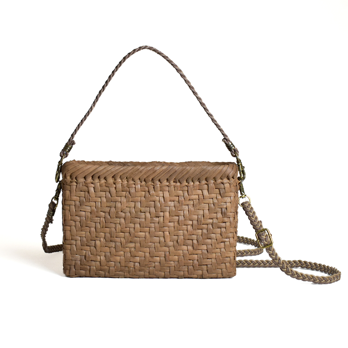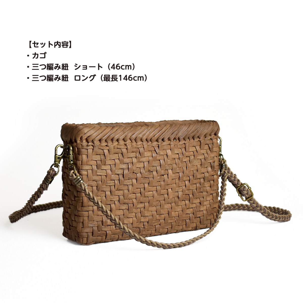 ロービキ紐2色で編んだ紐は、ショルダー用と手提げ用の2つをお付けします。